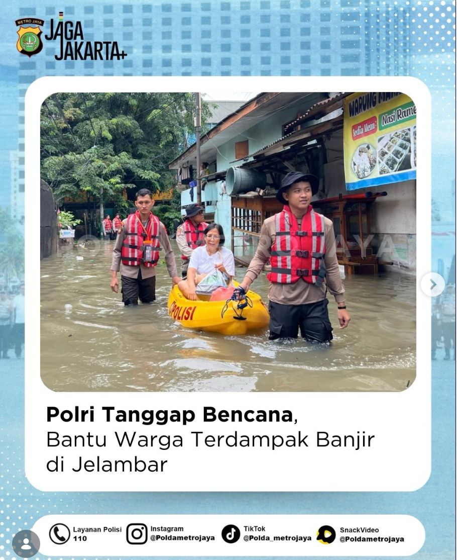 Di tengah genangan air yang merendam kawasan Jelambar, personel Sie Pammat Subdit Gasum Dit Samapta Polda Metro Jaya hadir membantu warga yang terdampak banjir di Jl. Satria, Grogol Petamburan, Minggu (8/3/2026) pagi. Petugas berpatroli sekaligus membantu evakuasi warga yang membutuhkan.